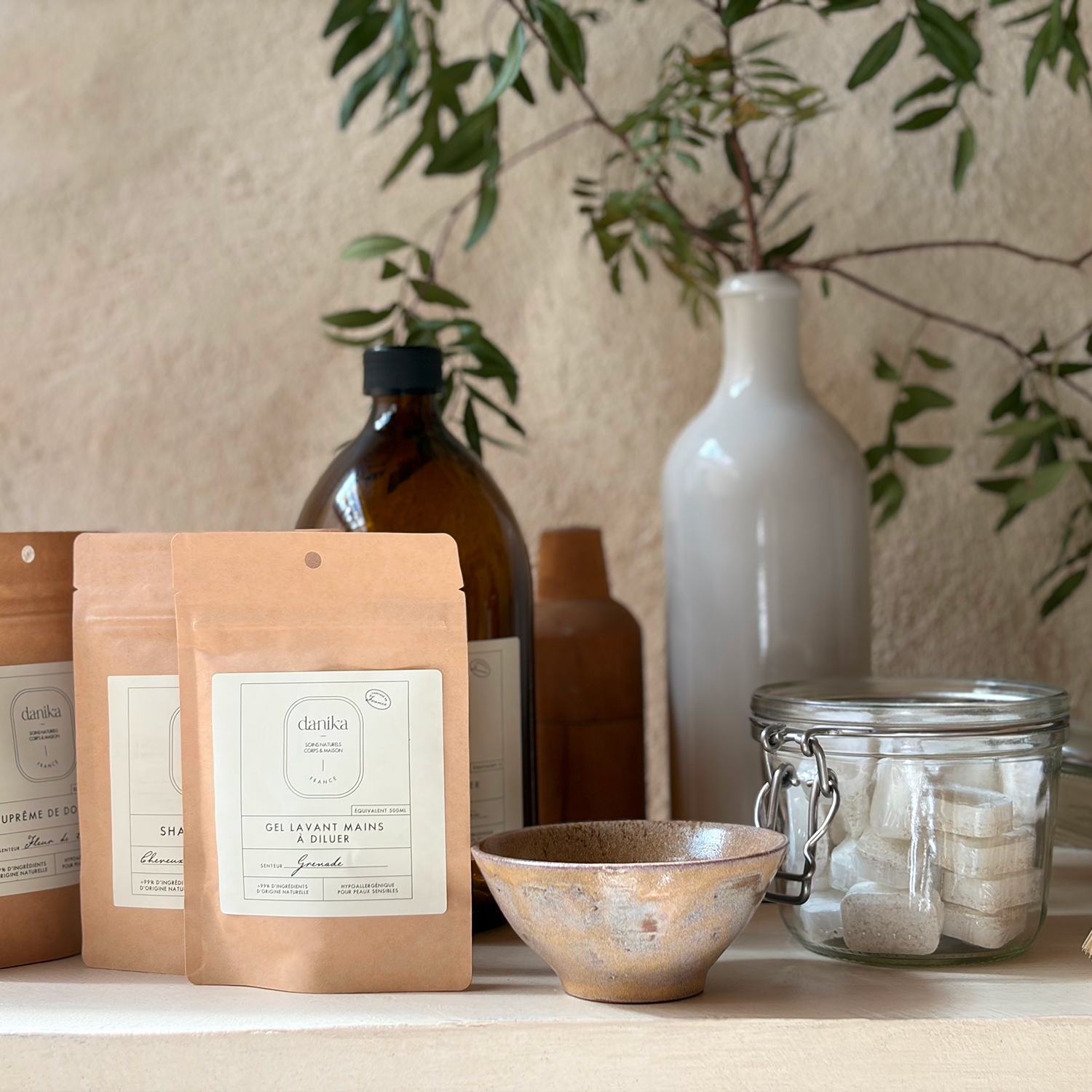 Les recharges Danika sont conditionnées dans un sachet compostable en papier kraft doublé d’amidon de maïs. Ce choix réduit considérablement les déchets plastiques et diminue l’impact écologique lié au transport. Combiné au flacon en verre réutilisable, ce système favorise une consommation plus responsable et durable.